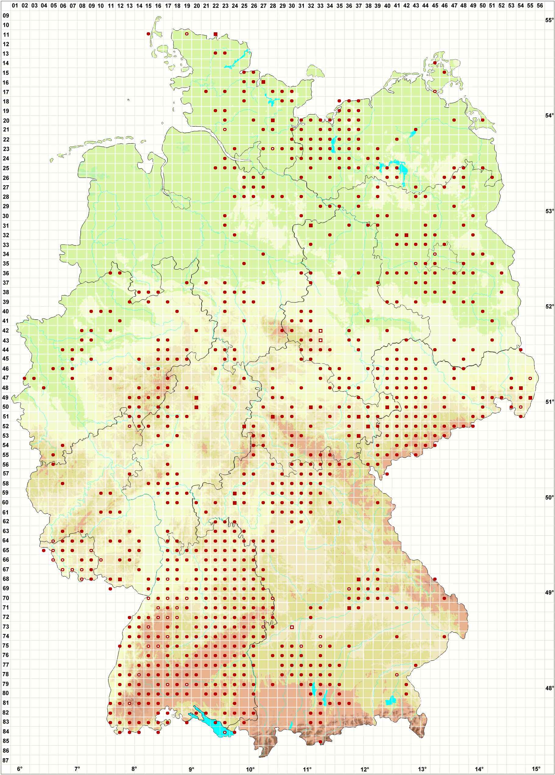 Bitte wechseln Sie zu einem Bundesland, um detailliertere Darstellungen für einzelne Fundstellen einzusehen oder eine genauere Karte zur Weiterverwendung zu beziehen.