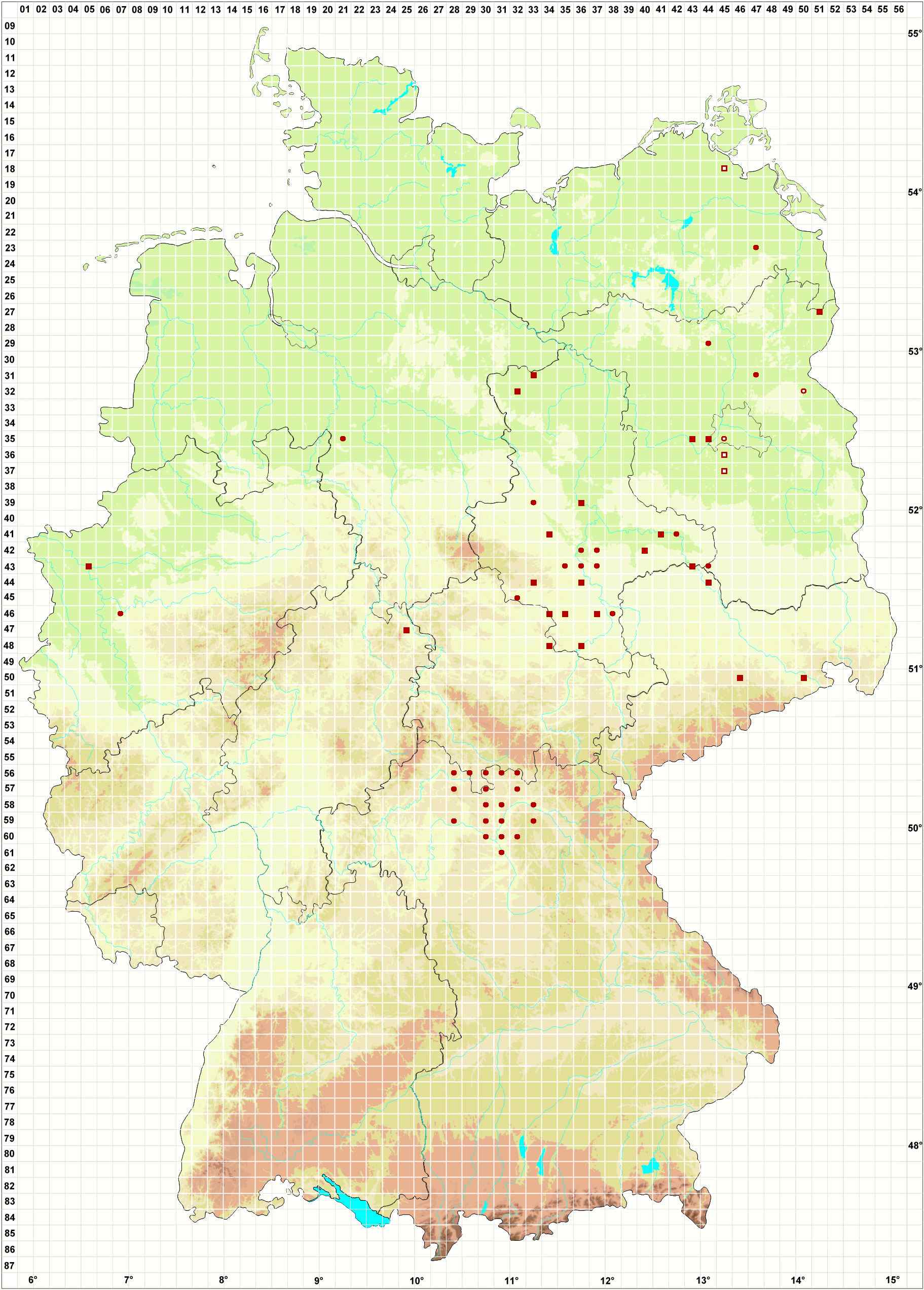 Bitte wechseln Sie zu einem Bundesland, um detailliertere Darstellungen für einzelne Fundstellen einzusehen oder eine genauere Karte zur Weiterverwendung zu beziehen.