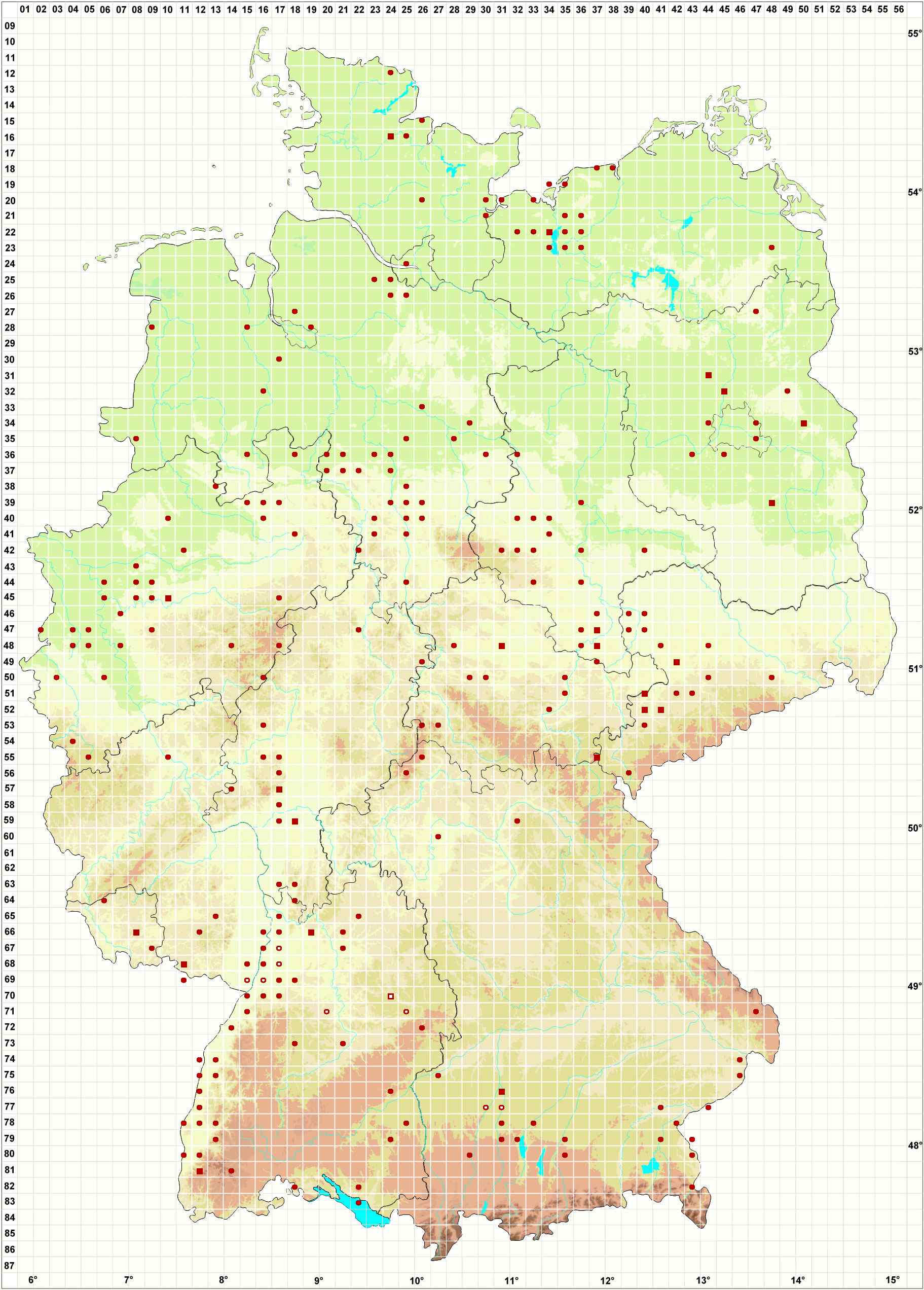 Bitte wechseln Sie zu einem Bundesland, um detailliertere Darstellungen für einzelne Fundstellen einzusehen oder eine genauere Karte zur Weiterverwendung zu beziehen.